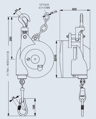 繩索:高強(qiáng)度鋼繩,帶彈性繩索縮回限制裝置和用來(lái)吊掛物體的螺旋彈簧保險(xiǎn)鉤。繩索長(zhǎng)度可通過(guò)一個(gè)繩鎖進(jìn)行無(wú)級(jí)調(diào)節(jié)。通過(guò)一個(gè)繩夾可無(wú)級(jí)縮短工作行程。